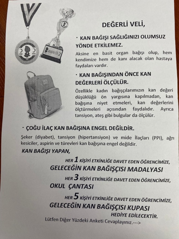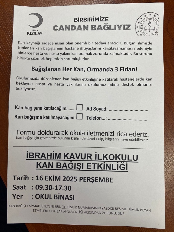 16 Ekim 2025 Perşembe günü Kızılay Kan Merkezi tarafından okulumuz Konferans Salonunda Kan Bağışı Etkinliği düzenlenecektir. Tüm velilerimizin katılımlarını rica ederiz.